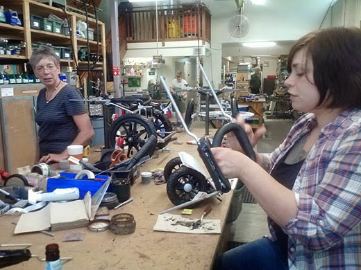 I have since traveled to their facility in Shelburne Falls, MA, spent quality time with Leslie and Eddie, toured the shop, met their employees, and received expert instructions on making cart adjustments. I’m a fan. But long before this I was convinced of their product’s superiority through experience ordering them for patients and seeing the beautiful design, quality and workmanship. Eddie Grinnell, a mechanical engineer, combined his expert skills with love of pets to invent a cart design which is closely aligned to the dog’s center of gravity and natural axis of motion at the hip and shoulder joints. This is very important in helping accurately mimic the pet’s normal movement and prevent pulling or strain.